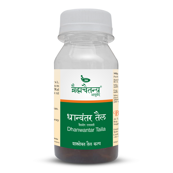 Shree Brahmachaitanya Ayurveda's Dhanwantar Taila is a meticulously prepared, classical Ayurvedic medicated oil, revered for its profound healing and rejuvenating properties. This sacred formulation, rooted in the wisdom of ancient texts, is crafted through an elaborate and traditional process (Sneha Kalpana) that ensures the therapeutic essence of over 45 powerful herbs is fully infused into a base of Sesame oil. Key ingredients like Bala (Sida cordifolia), Ashwagandha (Withania somnifera), and the divine Jivaniya herbs (like Jivak, Rishabhak, Kakoli, Kshirakakoli) work in synergy to nourish tissues, strengthen the nervous system, and promote overall vitality. Renowned for its effectiveness in managing Vata disorders and musculoskeletal conditions, this oil embodies our commitment to authenticity, purity, and the highest standards of Ayurvedic pharmacy, making it a trusted choice for practitioners and individuals seeking deep, holistic healing.
